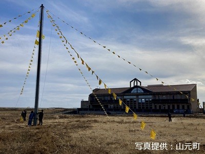 校舎横の広場に掲げられた多くの黄色いハンカチは、震災後に町内の避難所で掲げられたことをきっかけに、毎年架け替えられながら希望の象徴として受け継がれています。